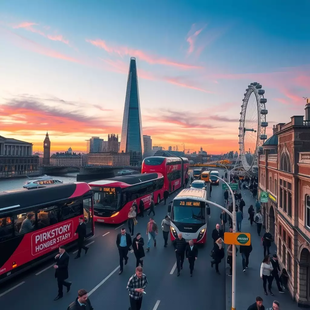 A vibrant cityscape of London at twilight, featuring iconic landmarks like Tower Bridge, the Shard, and the London Eye, bustling streets filled with diverse crowds, and hints of seasonal changes reflecting the city's growth and transformation over time.