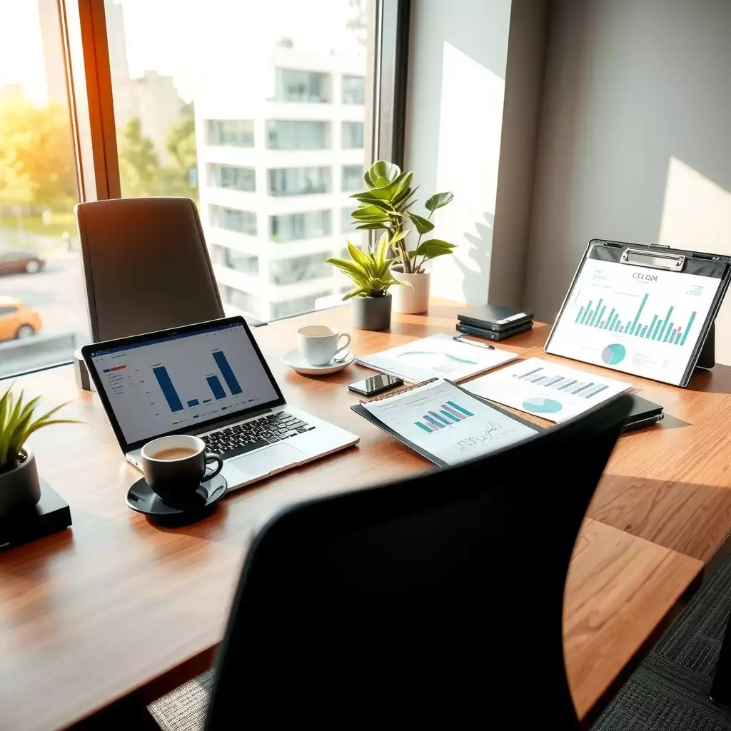 A modern office setting featuring a sleek desk with financial documents, a laptop displaying charts, and a cup of coffee, emphasizing professionalism and focus in preparing for a bank loan.