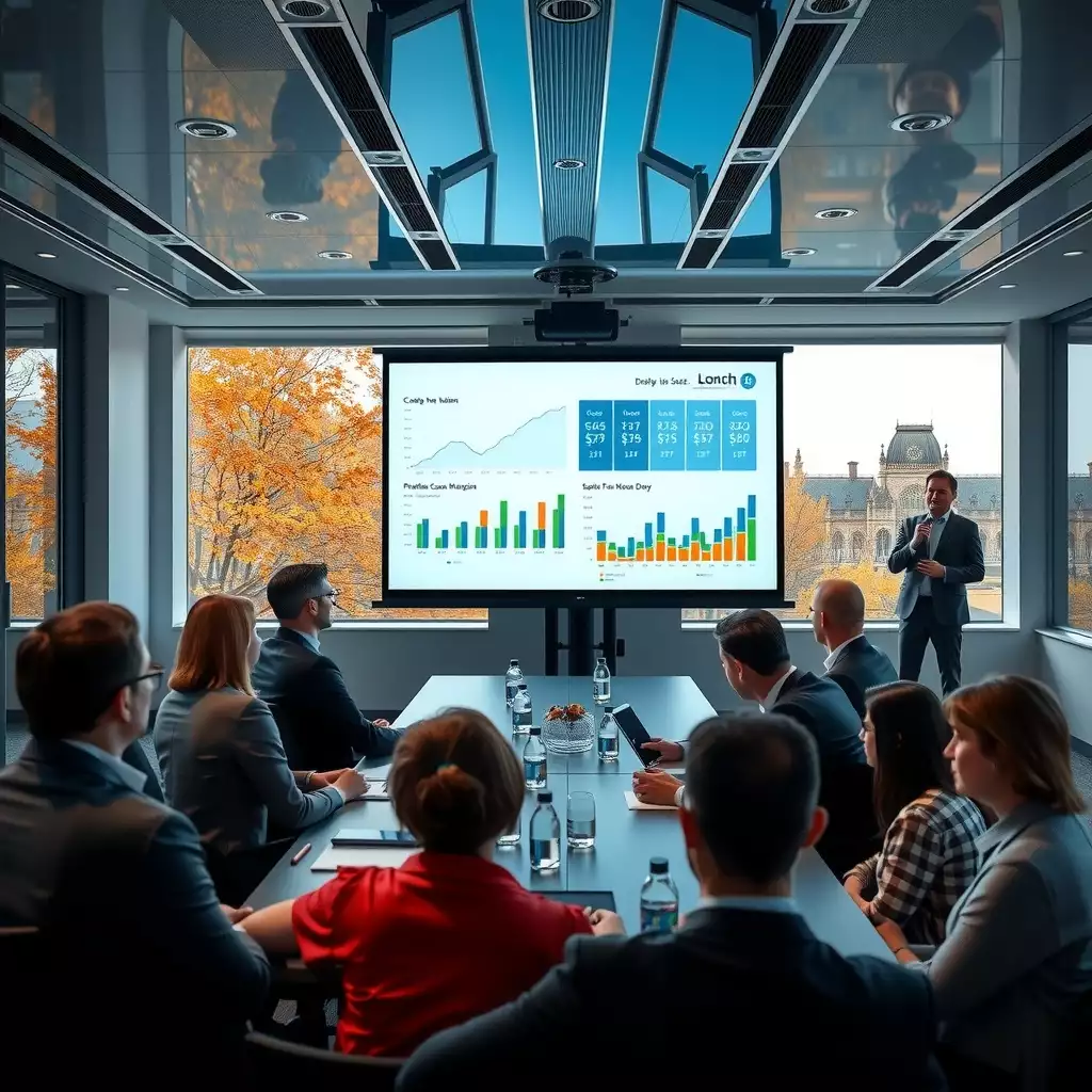 A modern conference room filled with attentive investors, engaged in discussion around a polished presentation screen displaying graphs and data, evoking a sense of professionalism and clarity.